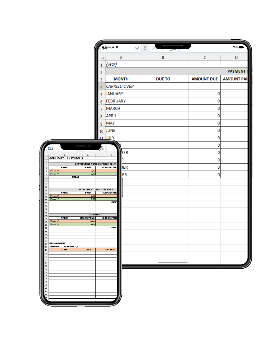 - Accurate reimbursement tracking - Built-in formulas automatically calculate each parent's share, track payments made and show outstanding balances at a glance.