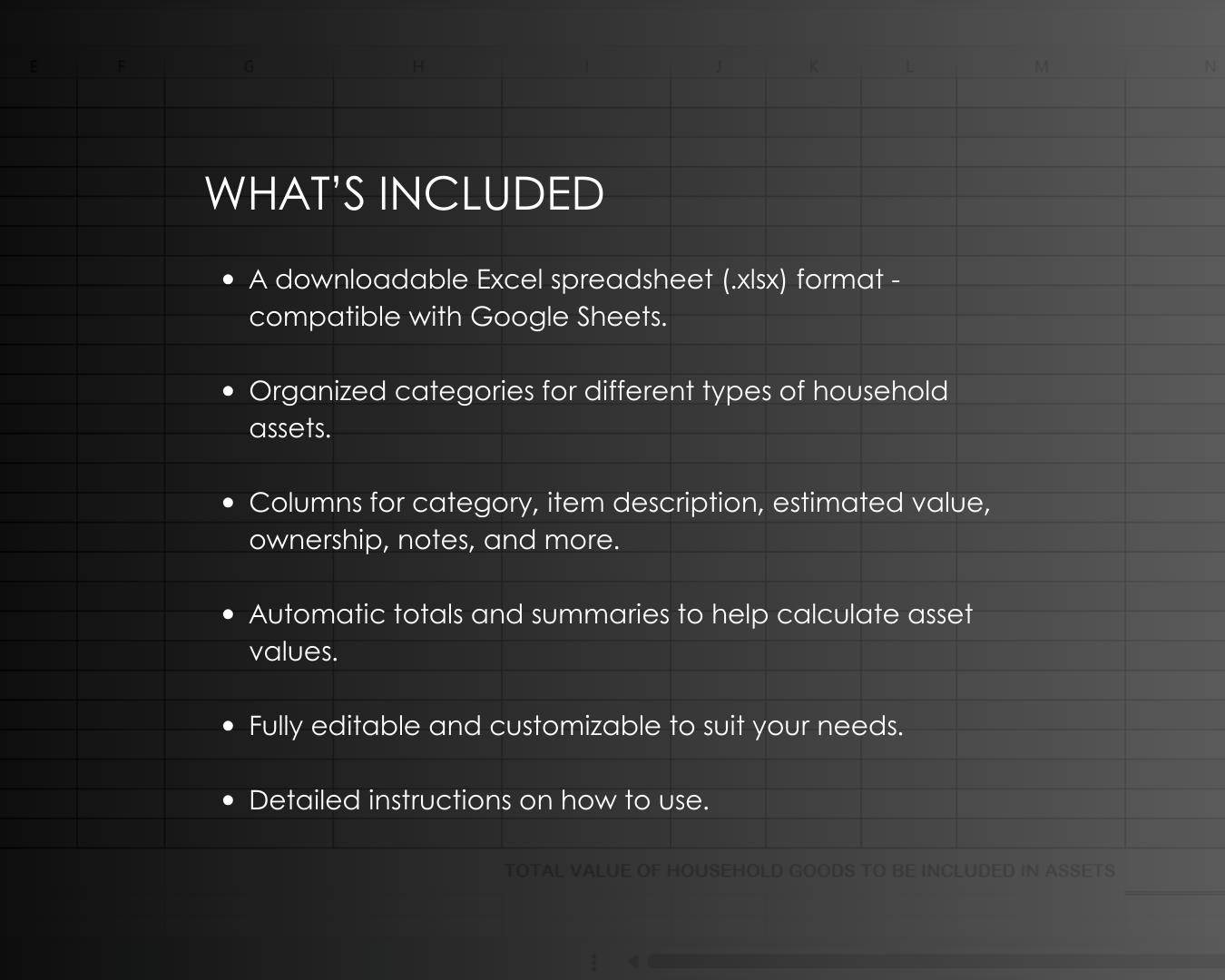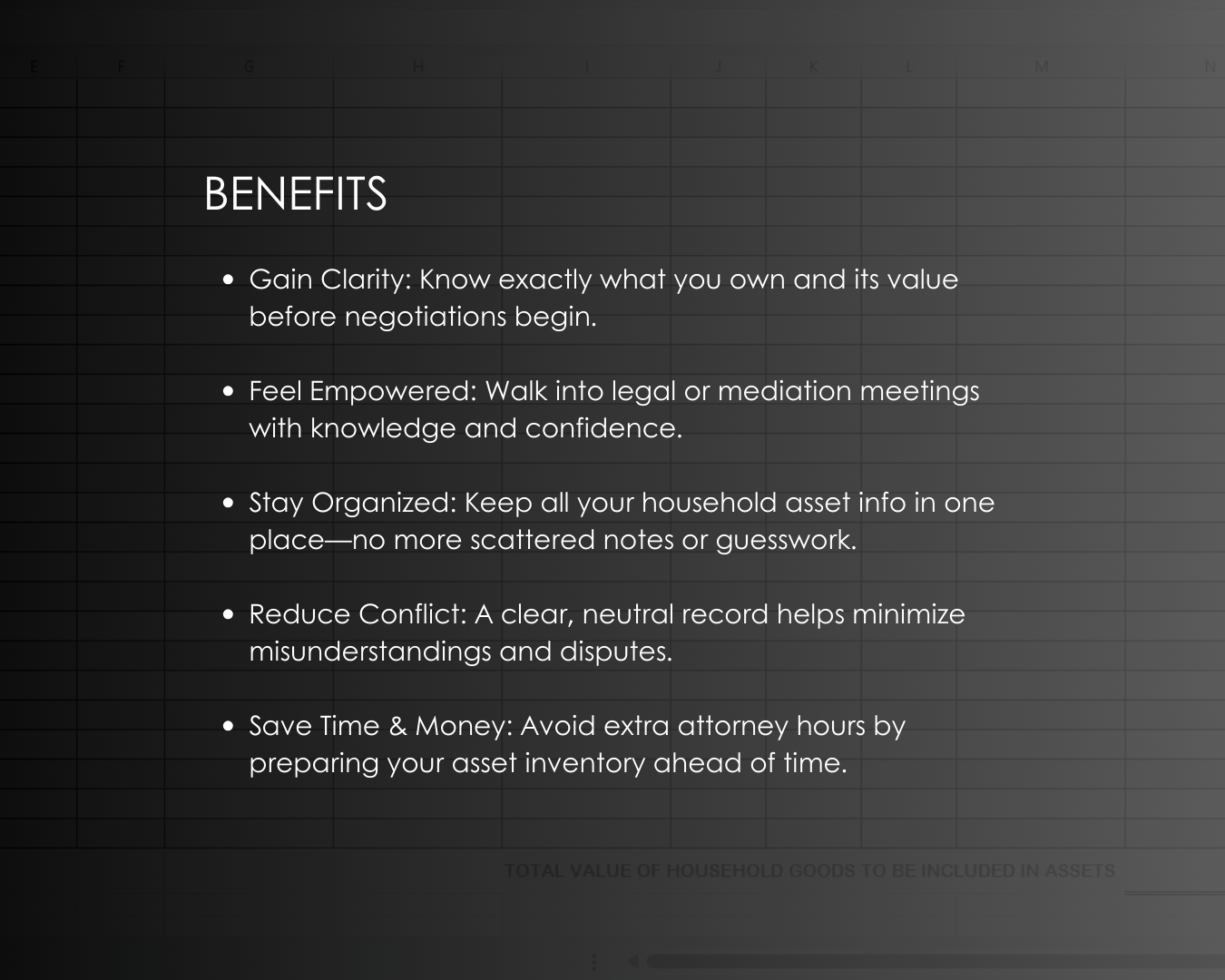 Designed specifically for individuals navigating divorce, this easy-to-use Excel spreadsheet helps you to catalog and value everything inside of your home—from furniture and appliances to artwork and tools—so that you can make informed, confident decisions when it comes time to divide assets.
